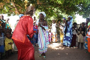 Anschließend fuhren wir mit dem Jeep von WV nach Dialambere. Die Fahrt dauerte etwa 40 Minuten. Unser Patenkind Tacko begrüßte uns als erste. Sie ist zutraulich, aber sehr still und schüchtern. Ein großer Teil des Dorfes war zu unserer Begrüßung erschienen. Es wurde gesungen und getanzt und Willeke und schließlich auch Thomas tanzten mit. Tacko schenkte uns beiden jeweils einen mit Perlen geschmückten Stab, wie er nach der Tradition den Jungen am Tag ihrer Beschneidung übergeben wird.