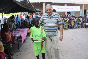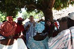 Thomas bekam einen weiß-blau gestreiften "Boubou" (langes Gewand) übergestreift. Die mitgebrachten Geschenke wurden mit Hilfe der Mitarbeiter von WV, dem Dorfältesten und dem Dorf-Imam möglichst gerecht verteilt. Es herrschte helle Aufregung, aber zum Schluss waren alle zufrieden. Für später ankommende Kinder wurden Geschenke zurückgehalten. Dabei konnte es schon geschehen, dass ein Junge ein Mädchen-T-Shirt in die Hand gedrückt bekam.