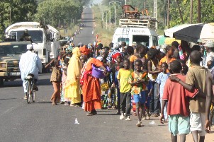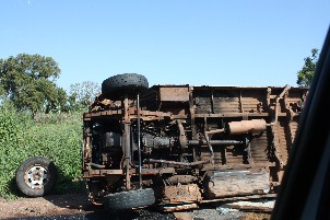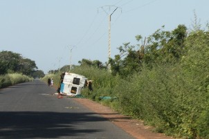 Wir wurden von einem Mitarbeiter von WV am Hafen abgeholt. Die Straßen ab Ziguinchor sind mit tiefen Schlaglöchern übersät. Zu unserer Überraschung sahen wir immer wieder bewaffnete Soldaten am Straßenrand stehen und wir fuhren an mehreren kleinen Panzerwagen, bestückt mit Maschinen- gewehren und kleinen Kanonen, vorbei. Maurice Faye, Leiter des WV-Büros in Kolda, erzählte uns später, dass das eine Vorsichtsmaßnahme sei, weil kürzlich ein Militärposten von Rebellen überfallen wurde und dabei 6 Soldaten getötet wurden. In der Casamance gibt es seit vielen Jahren Unruhen und bewaffnete Überfälle, vielfach aus dem benachbarten Guinée-Bissau und Guinea-Conakry.