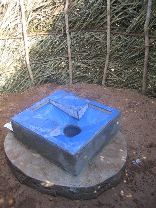 Einfache "Eimerdusche" und französische Toilette auf einem Betonsockel. Ein Brunnen befindet sich in etwa 700 m Entfernung, weitere Brunnen werden noch angelegt.