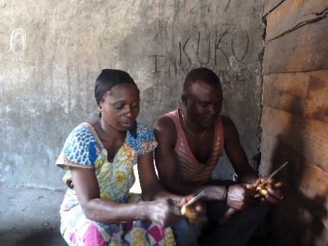 Mama Coletta und Papa Akili, der Gärtner und Hausmeister des Heims, schälen gemeinsam Kartoffeln für die insgesamt 26 Personen im Heim!!!