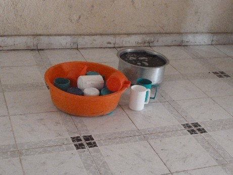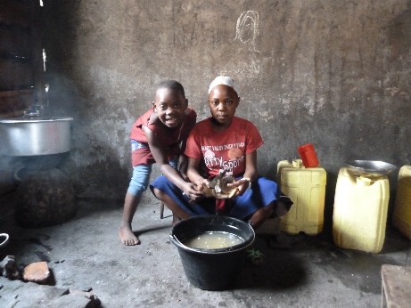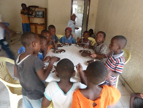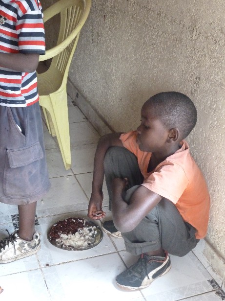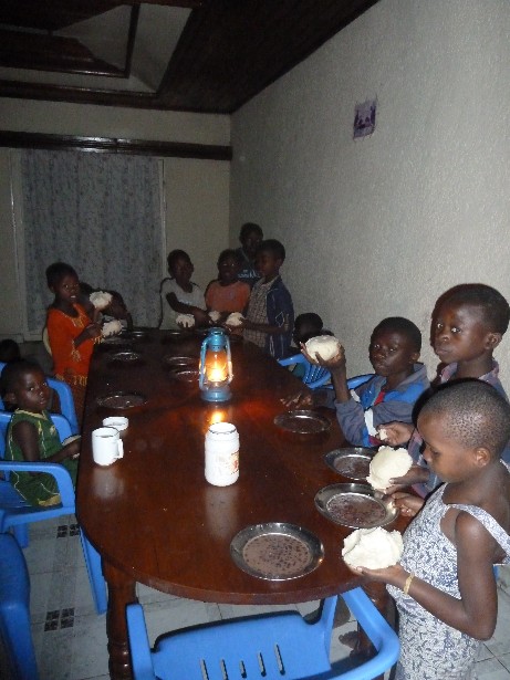 Fufu ist das meist gekochte Gericht in unserem Heim. Aus einem Teig aus Maismehl werden Klöße geformt und mit einer Soße aus Tomaten, Zwiebeln und Gewürzen angerichtet. Das Fufu wird in die Soße getunkt und gelutscht. Als Gemüse gibt es dazu häufig große Bohnen.