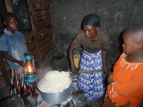 Neben dem Haus in einem Holz-schuppen befindet sich die traditionelle Küche. Auf einem kleinen Feuer auf drei Steinen bereitet Mama Coletta das Abend-essen (Fufu) im Schein einer Petroleumlampe vor, denn in Goma fällt häufig der Strom aus.