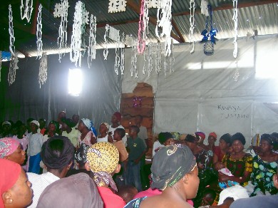 Wir besuchten auch ein Flüchtlingslager am Rande der Stadt, in dem 2500 Menschen untergebracht sind. Ich kann kaum beschreiben, wie die Menschen dort seit 7 Monaten in selbstgebauten Zelten wohnen (ein Gerüst aus Zweigen, aufgefüllt mit Bananenblättern oder ähnlichem). Manche haben ihre Zelte mit kaputten Plastikfolien, die sie irgendwo gefunden haben, abgedeckt. Matratzen gibt es nicht, nur ein wenig Stroh auf dem Boden. Auch haben die Menschen keine Decken.