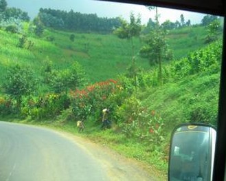 Bei meiner Reise durch Ruanda war ich fasziniert von der lieblichen, hügeligen, grünen Landschaft, den vielen Blumen in den schönsten Farben. Ruanda wird auch „das Land der 1000 Hügel“ genannt. Überall wird an den Straßen gearbeitet. Hügel werden per Hand abgegraben, um die Straßen zu verbreitern.