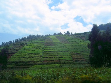 Menschen arbeiten gemeinsam auf den Feldern. Die Hänge sind in Parzellen angelegt und die Gräben unten an den Hügeln, die dazu dienen, von den Hängen abgerutschte Erde aufzufangen, werden überall sauber gehalten.